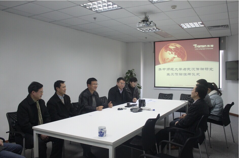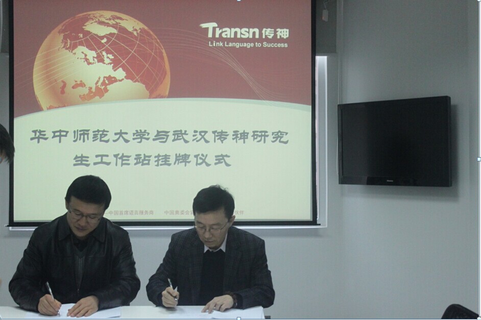 1月21日, 华中师范大学武汉传神信息技术有限公司研究生工作站,在武汉传神信息技术有限公司光谷软件园总部正式挂牌。华中师范大学研究生院李志明副院长同武汉传神信息技术有限公司副总经理付强先生,分别代表双方合作单位签署了《华中师范大学与武汉传神信息技术有限公司关于翻译硕士学位研究生专业实践协议书》等三项协议。李院长在签字仪式上对工作站设立的意义和合作方式做了说明,指出湖北省人民政府学位委员会和湖北省教育厅根据双方合作的基础,经过严格挑选,决定设立实习和实践工作站,以提高我校翻译专业研究生的实践能力,为专业硕士研究生培养打造一种有效的培养模式。传神公司付强副总经理对这种校企合作方式表示满意,表示积极为我校翻译专业研究生翻译实习和实践活动创造条件,提供良好的平台,进一步深化双方之间的友好合作。