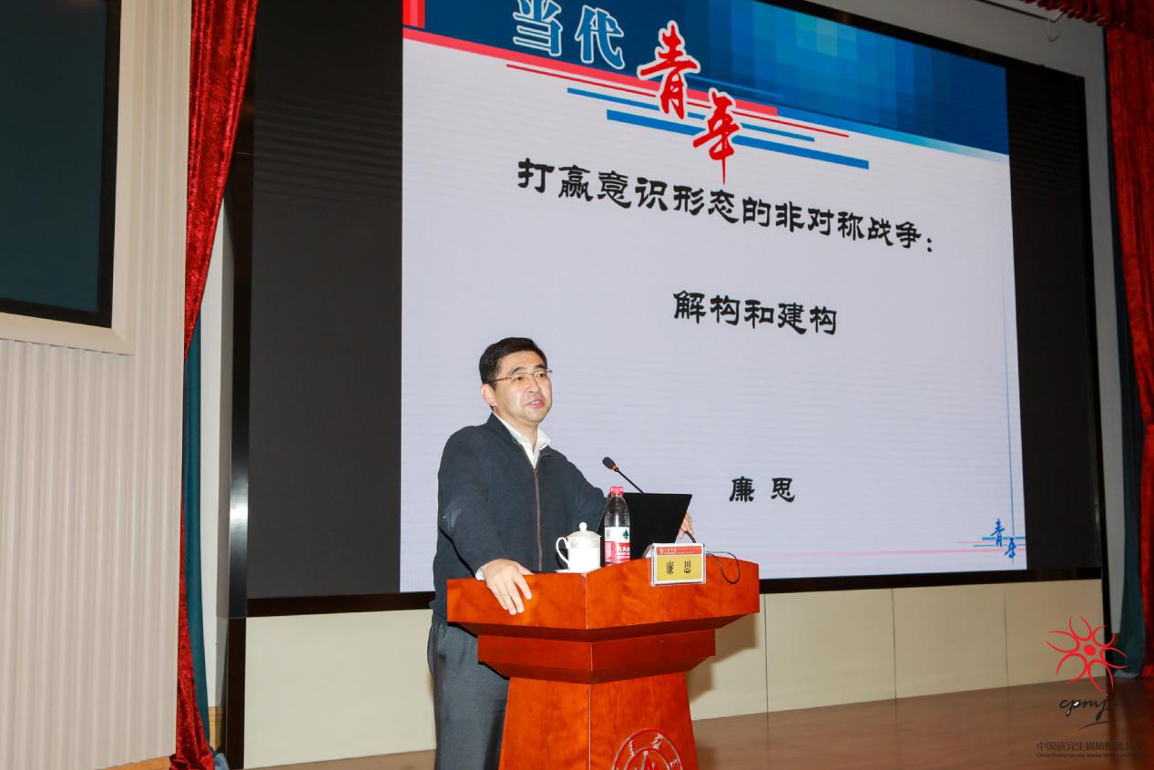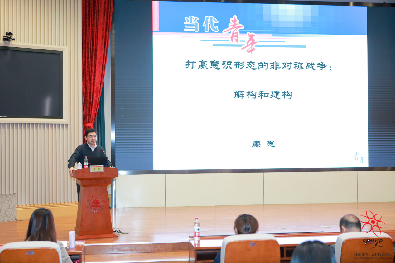 11月22日上午,知新楼A座三层报告厅和知新楼C座三层报告厅同时开展了研工沙龙和研究生媒体论坛。7位工作坊召集人在研工沙龙上发言并总结了工作坊的研讨内容,7位工作坊研究生代表在研究生媒体论坛分别作了关于媒体建设与发展的发言。发言结束后,在知新楼A座三层报告厅举行了学者主题报告大会活动,山东大学新闻传播学院副院长、博士生导师倪万以“后喻文化、技术迭代与媒介素养”为题,从新闻与传播学的角度分析了当代媒体人的能力和使命。对外经济贸易大学教授、博士生导师廉思以“打赢线形态的非对称战争:解构和建构”为题,分析新时代的媒体工作如何把握思想政治工作规律,深入人心、凝心塑心,赢得青年群体的情感认同和信任。