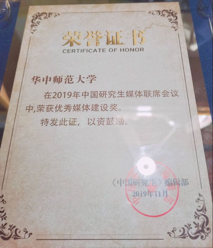 我校研究生院(研工部)事务办教师曹宇带领《研究生报》与研究生新媒体工作室执行主编袁婉婉、华中师范大学研究生学报执行主编徐文梦参与了此次会议。我校研究生官方媒体平台“华大研究生”在此次联席会议上表现不凡,从500余件参展作品、130多所参赛高校中脱颖而出,荣获“优秀媒体建设奖”、“最佳校园视频奖”、“我是中国研究生,我为祖国点赞”主题活动“优秀组织单位”、“最佳新闻摄影提名奖”、“最佳传播推广提名奖”等五大奖项。