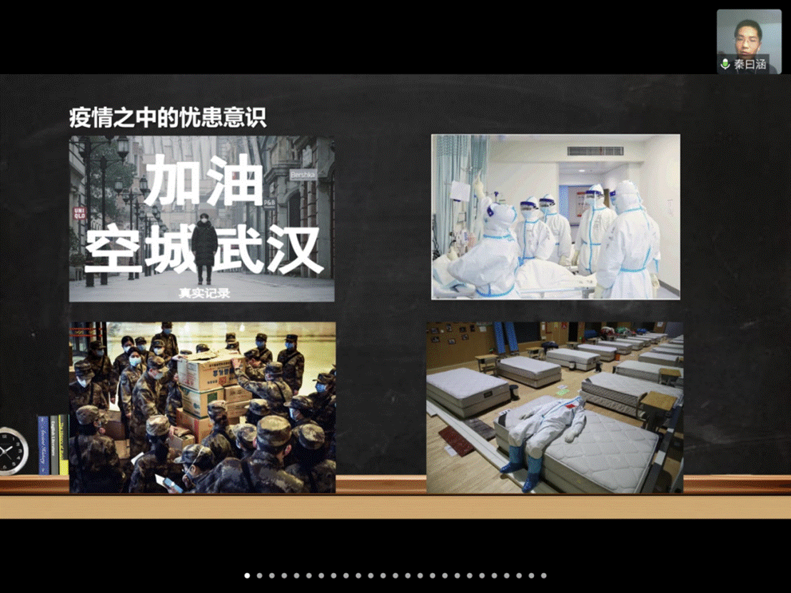 在“忧患何在”部分,主讲人回顾了新冠病毒肺炎疫情的发展过程和新闻报道,并表示尽管很多地区已经复工复产,武汉等城市也逐渐恢复往日的活力,但世界范围内防疫战争还未停止,国际上污名化中国的风向仍需警惕。同时,主讲人通过提问互动的形式,引导学生认识并理解家国情怀以及忧患意识的内涵。