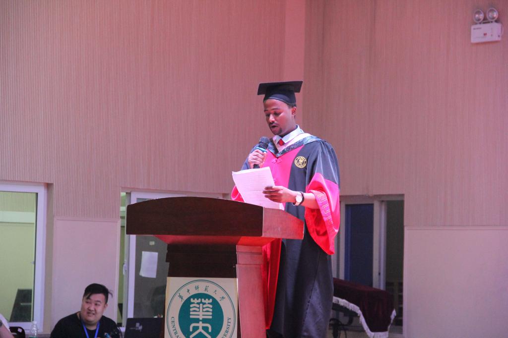 毕业生代表杨远艺同学诉说了对母校的感恩之情,对老师、同学的感谢之情,他承诺:未来会牢记恩师们的淳淳教诲,秉承着“大成政国、公行天下”的政国精神,勤于实践、踏实做事,一步一个脚印。留学生代表伊斯曼用中文表达了对中国的热爱、对政国的感谢。优秀硕士研究生代表杨家庆同学向老师同学们表达了最诚挚的感谢和最衷心的祝福。
