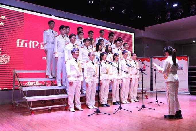 合唱环节师生们倾情献唱了十首歌曲,他们分别是由工程中心18级研究生演唱的《歌唱祖国》,由工程中心19级研究生演唱的《大中国》,由文产中心一队演唱的《保卫黄河》,由文产中心二队演唱的《爱我中华》,由伍伦贡一队演唱的《中国军魂》,由大数据18级本科生演唱的《新的天地》,由伍伦贡二队演唱的《打靶归来》,由大数据19级本科生演唱的《国家》,由教工合唱队演唱的《我和我的祖国》,以及由特邀嘉宾青年歌唱家陈小艺演唱的《洪湖水浪打浪》。