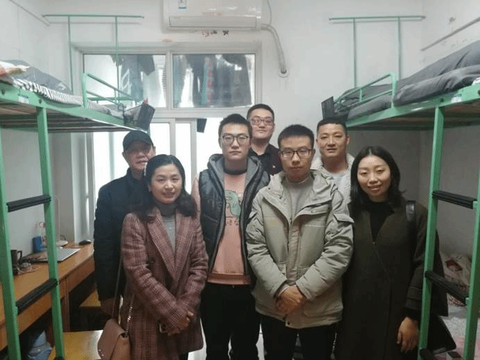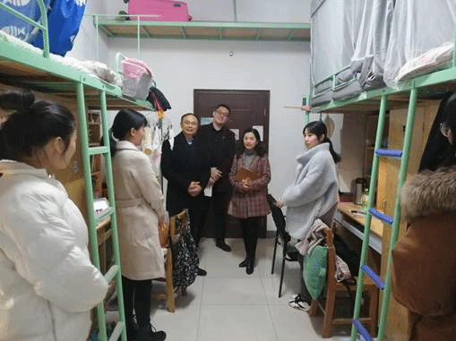 首先,学院领导和老师一行来到南湖8栋学生宿舍。段科长和印老师就南湖寝室的作息时间、学生寝室的各项管理制度等情况向院领导做了详细的介绍。学院领导走进308寝室,亲切地与同学们交谈。“你们本科是哪所大学的呀?”“每天上课通行方便吗?”“到这边生活还习惯吗?”麻旎副书记亲切地询问同学们的学习和生活状况,同学们也就寝室周边环境、安全等问题提出困惑和想法,保卫处段科长和印老师为同学们一一解答。走进309寝室,三位阳光开朗的男同学正在认真学习法语,整个寝室干净整洁、学习氛围浓厚。充分展现了外国语学院研究生阳光向上的精神风貌。